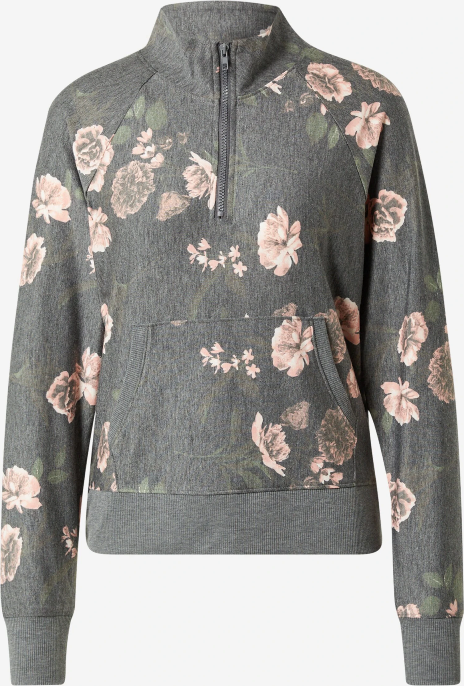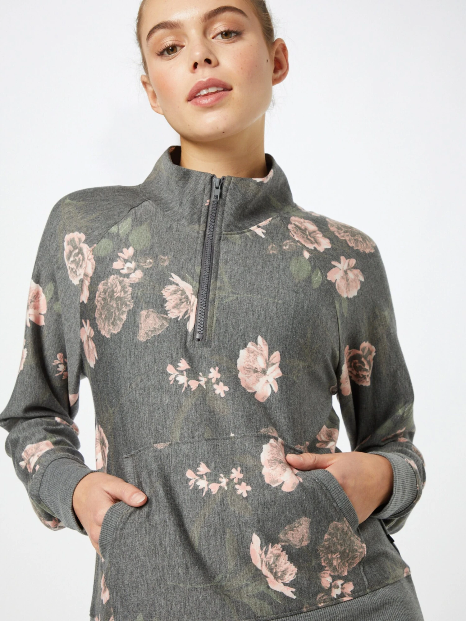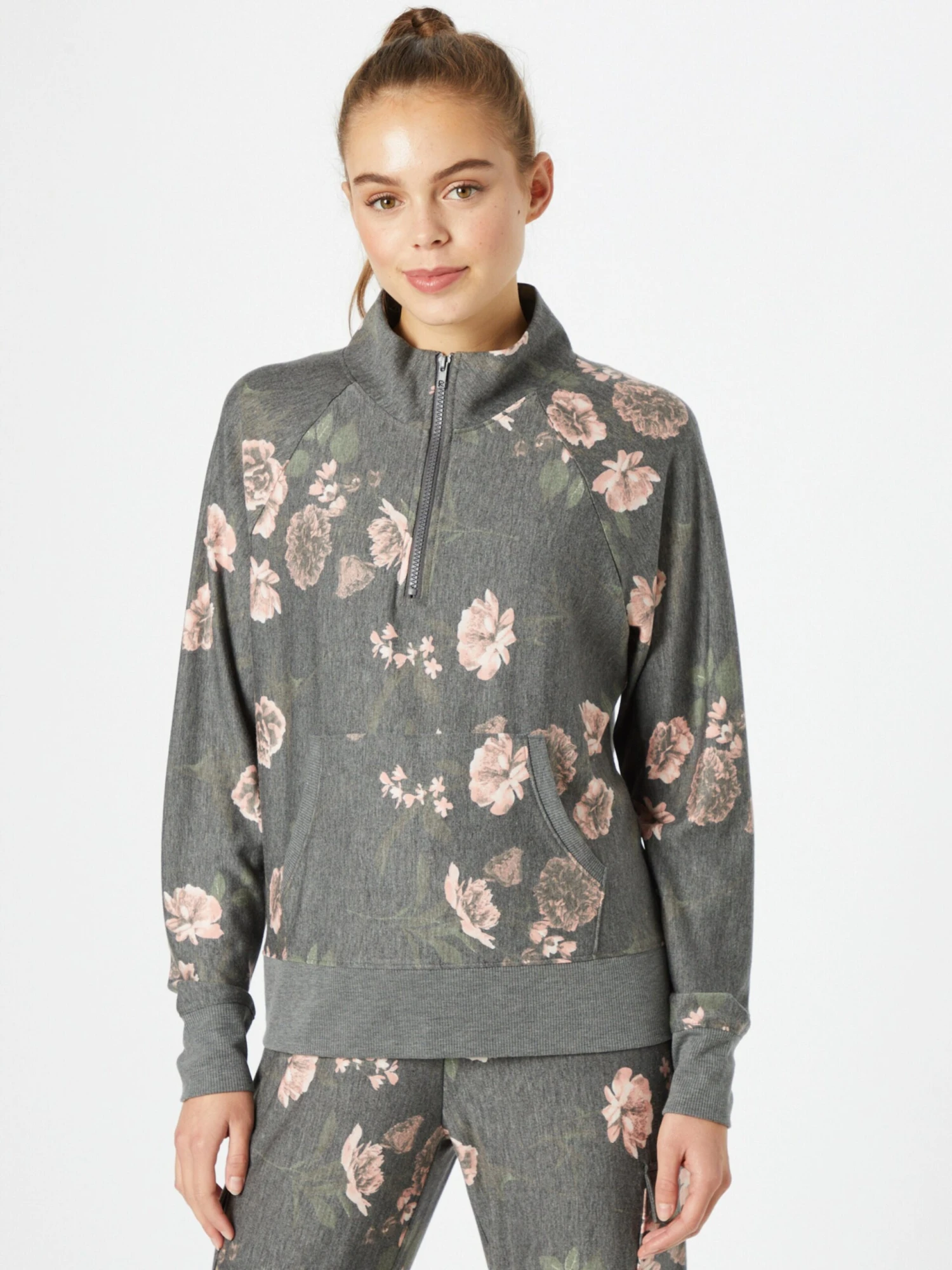 BloemenprintSweatstofSchipperskraagRaglanmouwenGeribd ceintuurtjeStaande kraagKangaroo zakHalve ritsAll-over patroonLicht gewichtRitssluiting