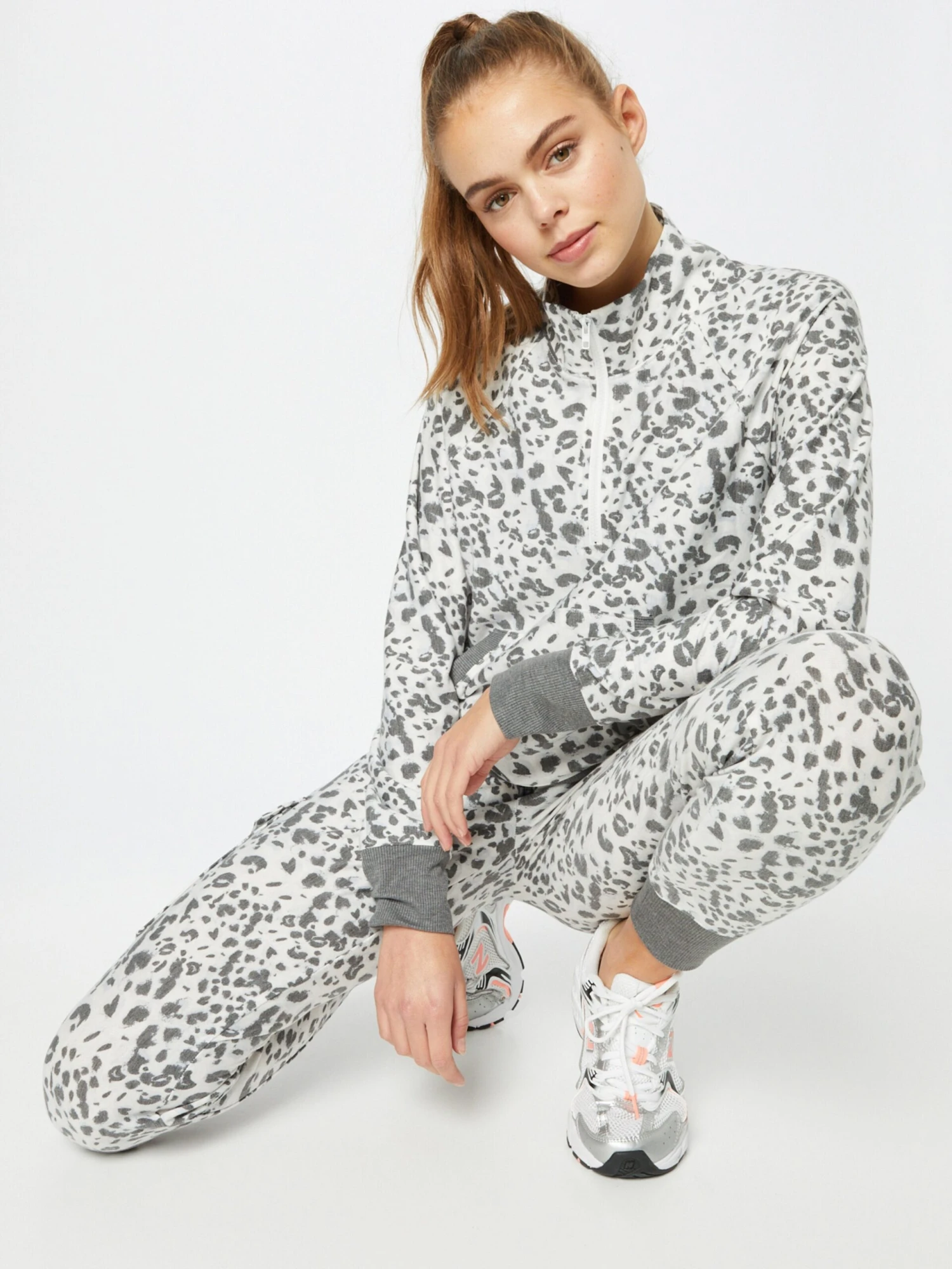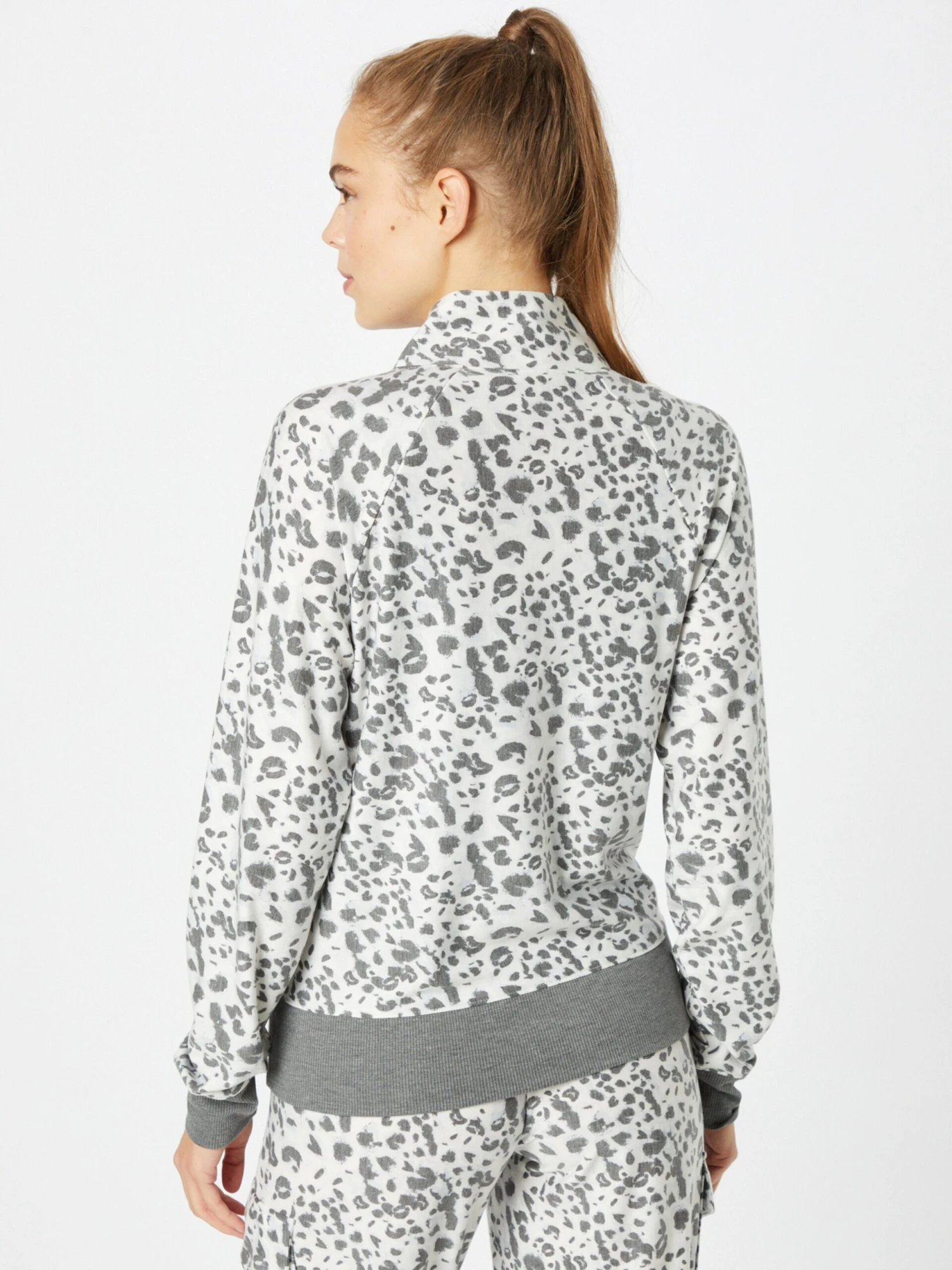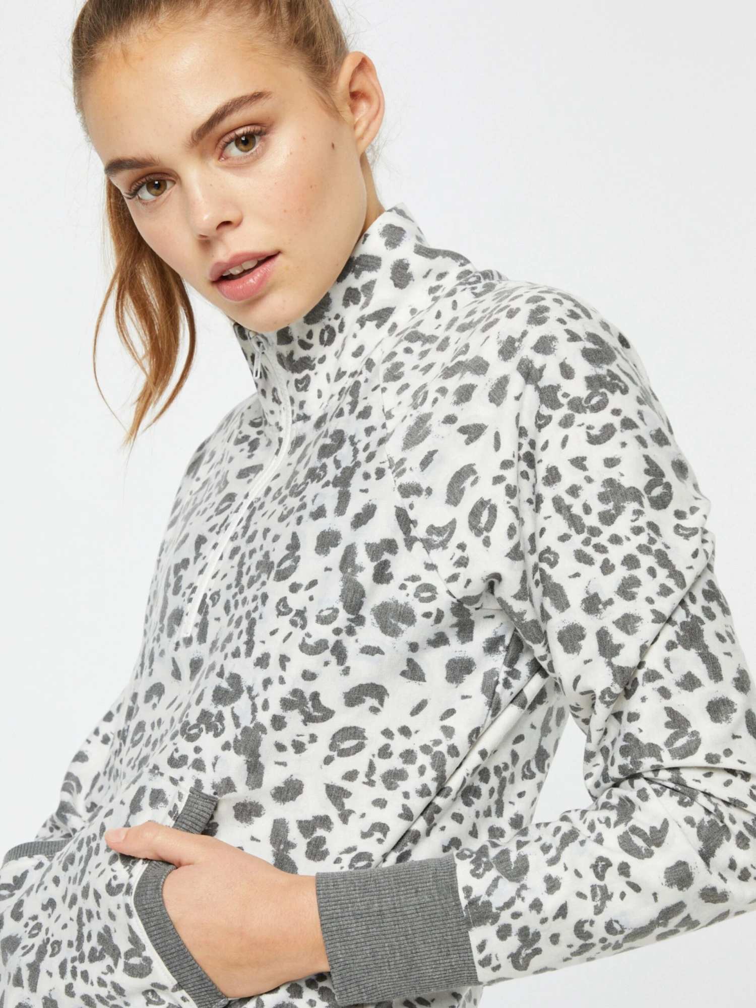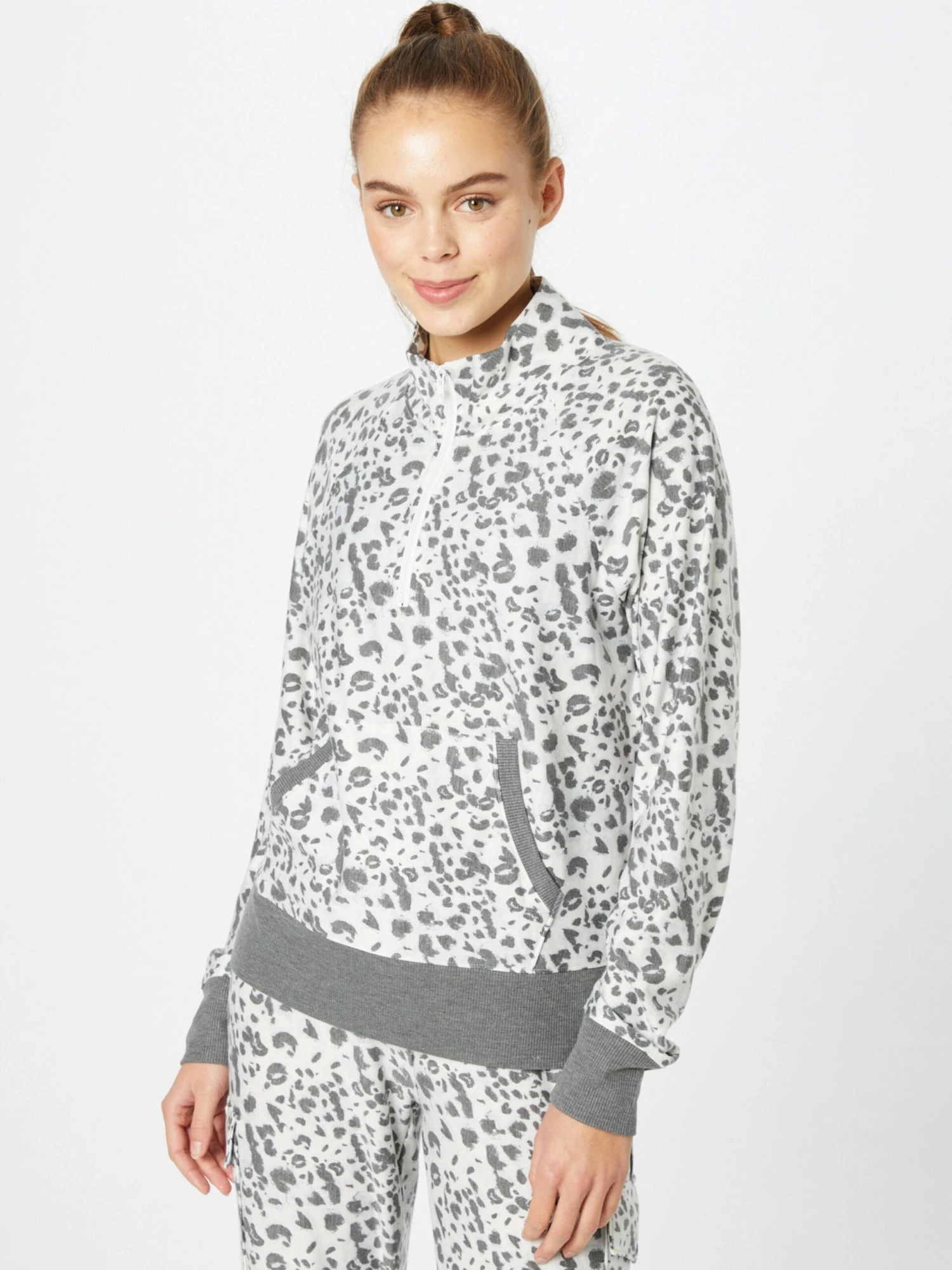 DierenprintSweatstofSchipperskraagRechte zoomRaglanmouwenGeribd ceintuurtjeStaande kraagKangaroo zakHalve ritsAll-over patroonVoelt zacht aanRitssluiting